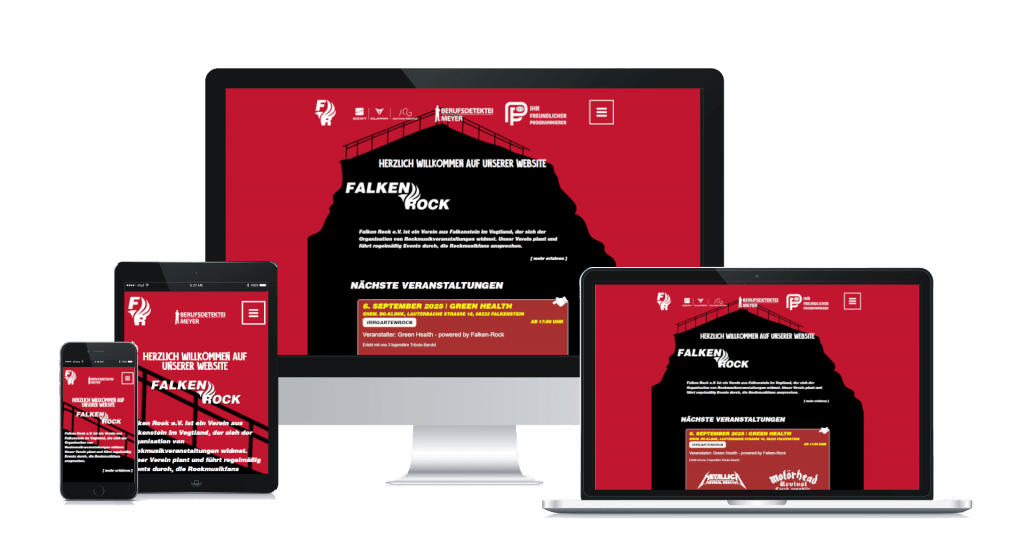 Für Falken Rock e.V. entstand eine WordPress-Festivalwebsite, die Programm, Bands, Sponsoren und Rückblicke übersichtlich bündelt und flexibel für kommende Jahre erweiterbar bleibt.