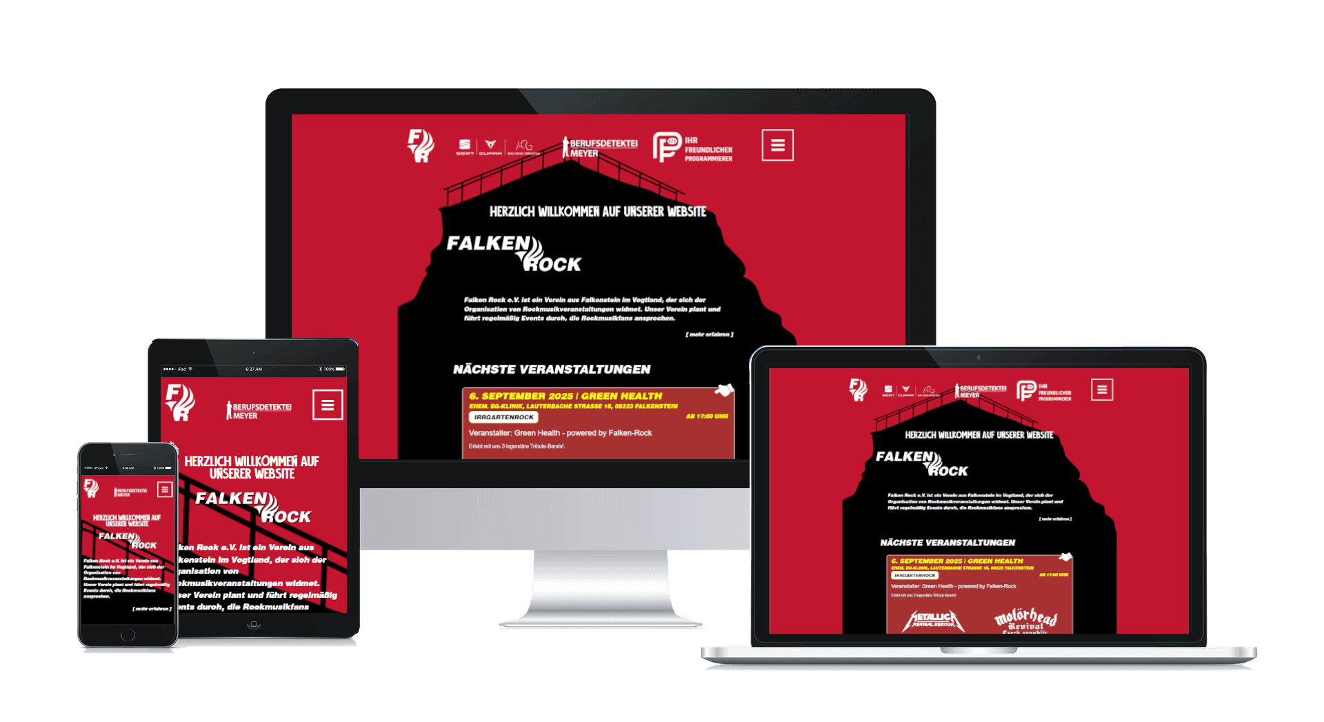 Festival- und Vereinswebsite für Falken Rock e.V., mit Fokus auf klar strukturiertes Eventprogramm, Band- und Sponsorenübersichten sowie Rückblicke auf vergangene Festivals.